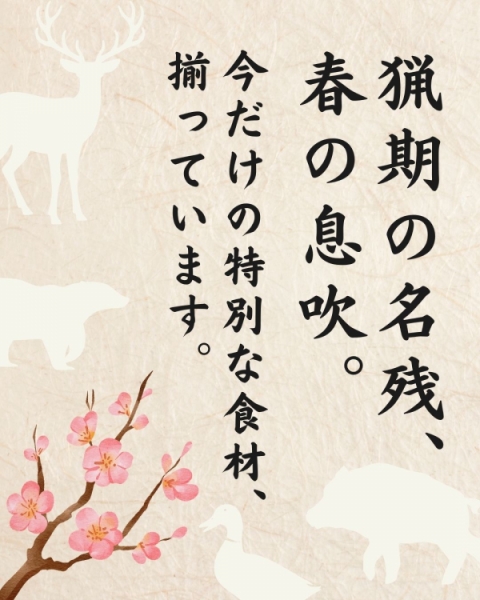【獣肉】 鹿(蝦夷/本州)、猪、穴熊、熊(ツキノワ/ヒグマ)、ハクビシン、アライグマ、キョン